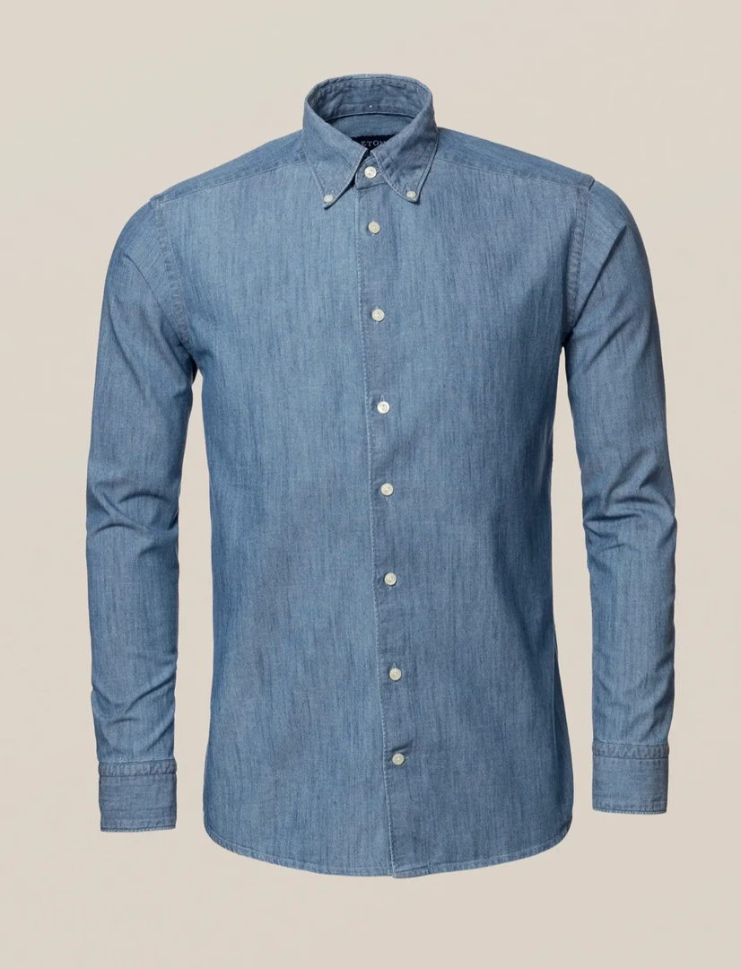 Our popular denim shirt makes a smart comeback with updated details. Cut from Italian-woven denim twill, the shirt is garment-washed for a rich mélange effect that becomes beautifully pronounced with wear. A versatile, timeless shirt suitable for any business casual or casual look. Brown button stitching and piping detail the style.