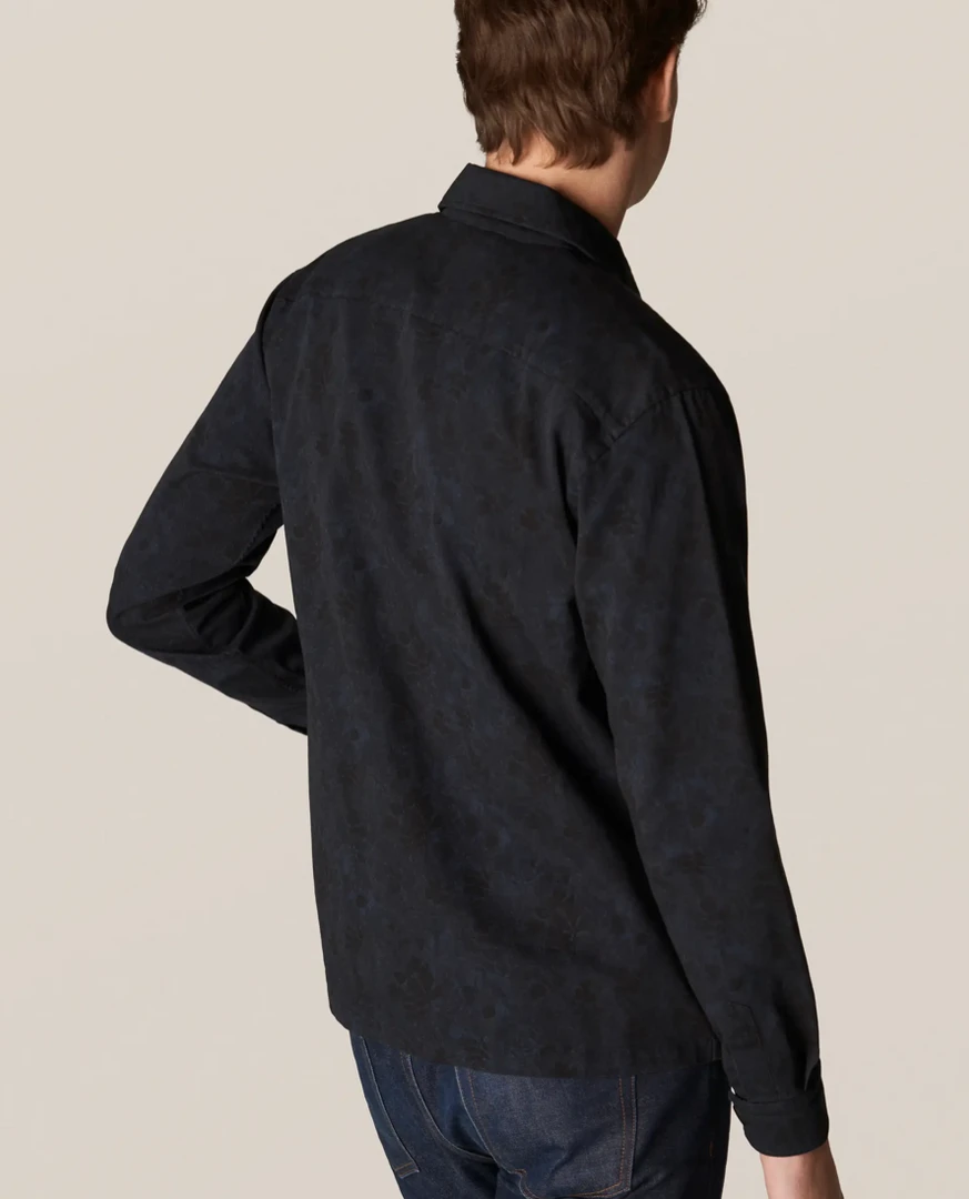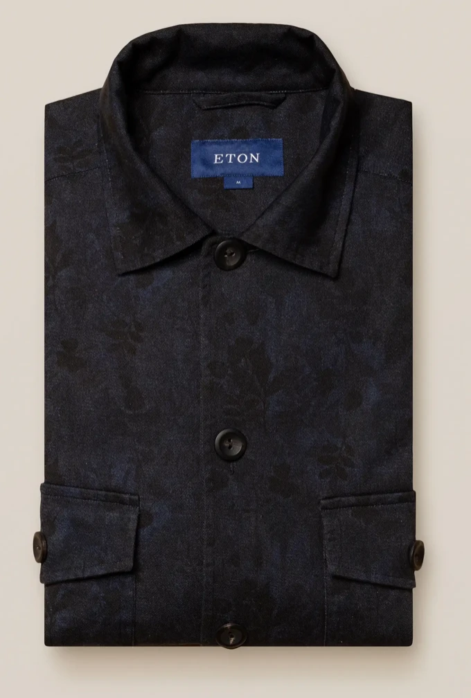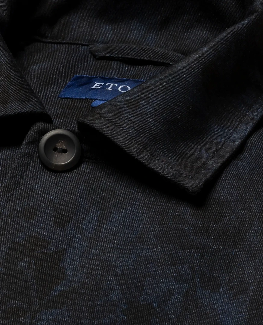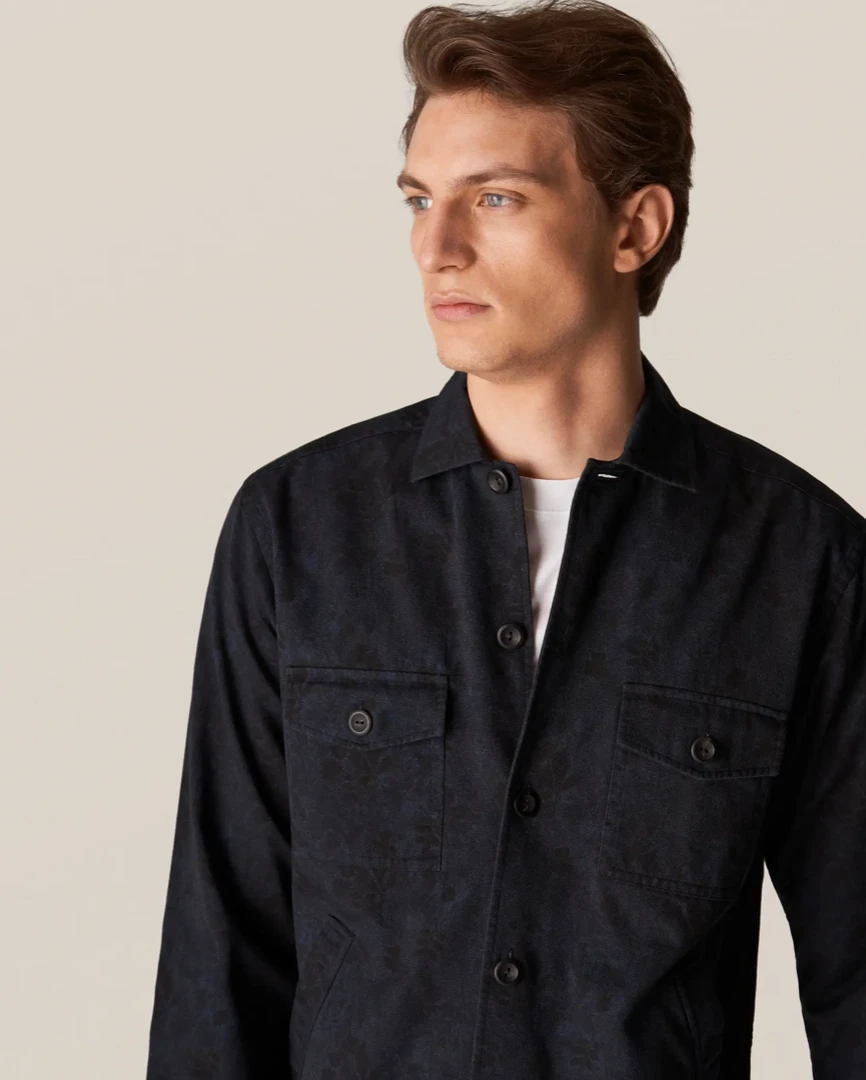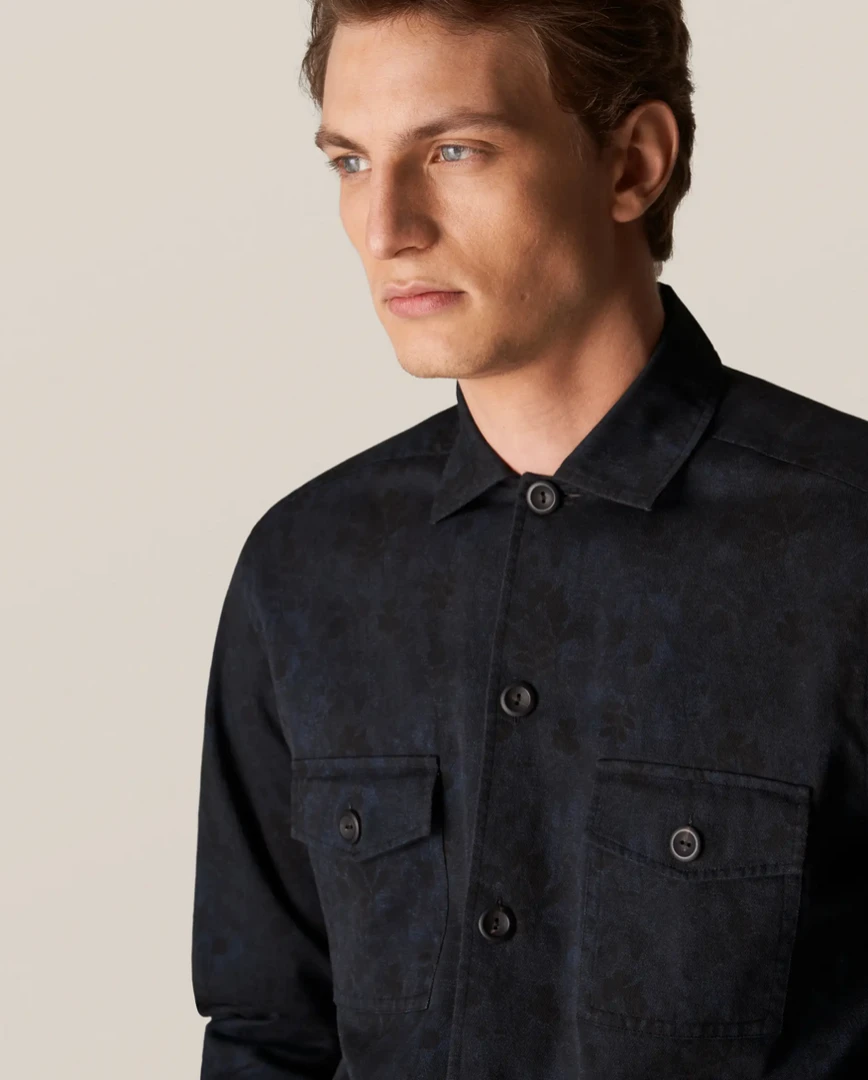 A four-pocket overshirt with a muted print with indigo effect. Decorative horn-effect buttons. A style statement, and a transeasonal shirt-jacket hybrid – made for indoor/outdoor living.