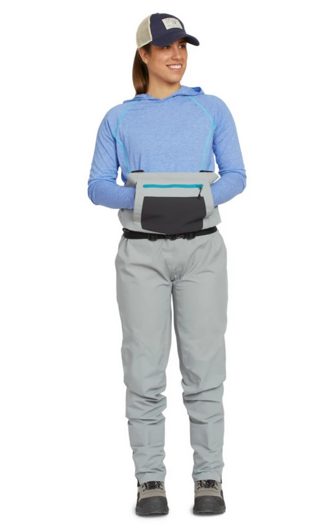 This new Clearwater fly-fishing wader is feature rich and designed specifically for a woman’s body in a modern fit to eliminate traditional bulk. Four-layer waterproof breathable nylon fabric is light yet durable, with a 30K Waterproofness / 8K Breathability rating. Opposing side-release buckles allow for waist-high conversion on warm days. External storage pocket with stretch panel for small items and fly boxes, plus a kangaroo-style handwarmer pocket on the front chest. Updated anatomical neoprene booties with Integrated neoprene gravel guards to reduce water drag and collection. Low-profile seam construction and low-profile belt loops with 1½” webbing belt included. Hook and loop patch on interior pocket to attach Orvis waterproof pocket (8G3H sold separately). In stone.