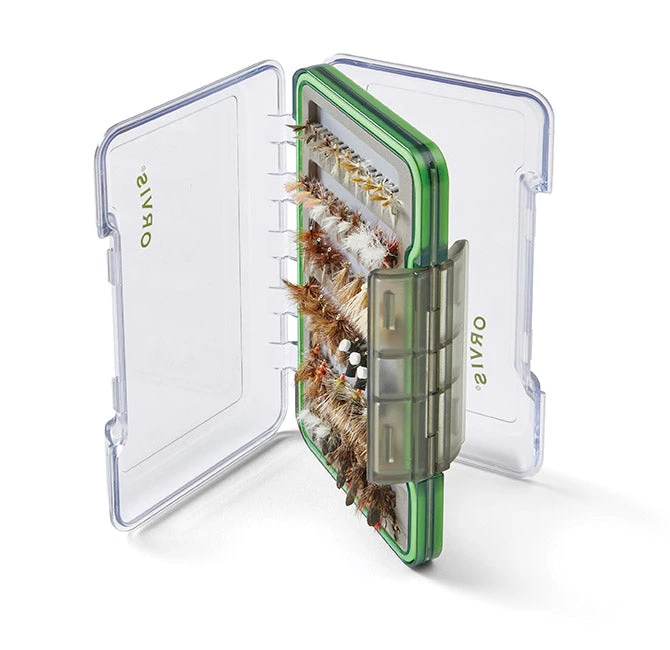 An updated and improved version of our classic Double-Sided Fly Box. Microslit foam tightly holds flies in place. Clear shell allows you to see the box’s contents. Box closure has seals to keep moisture out and strong latch clips to prevent accidental opening. Imported.
