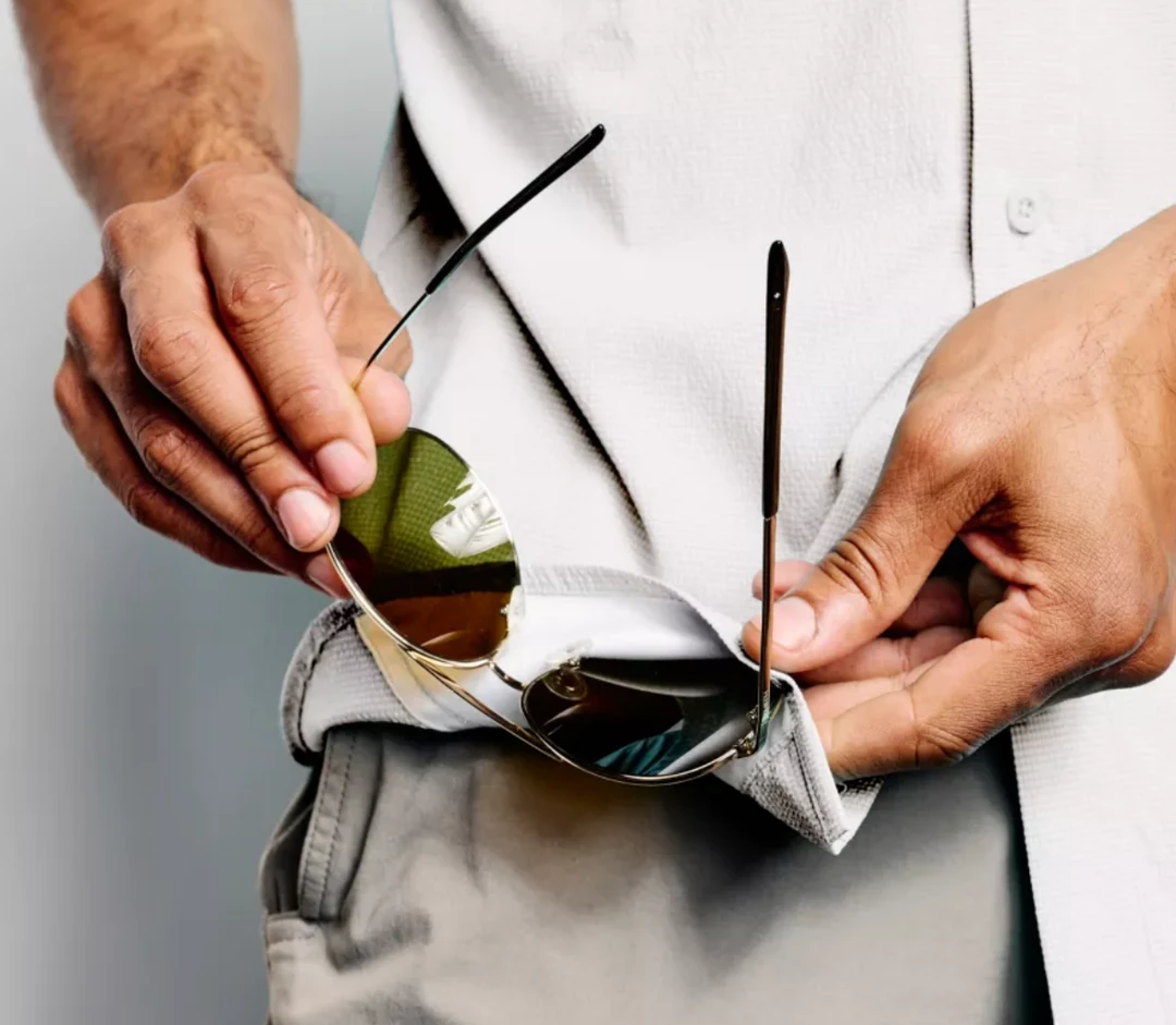 - Hidden sunglasses cleaner in hem keeps your vision clear, so you can focus on the cast