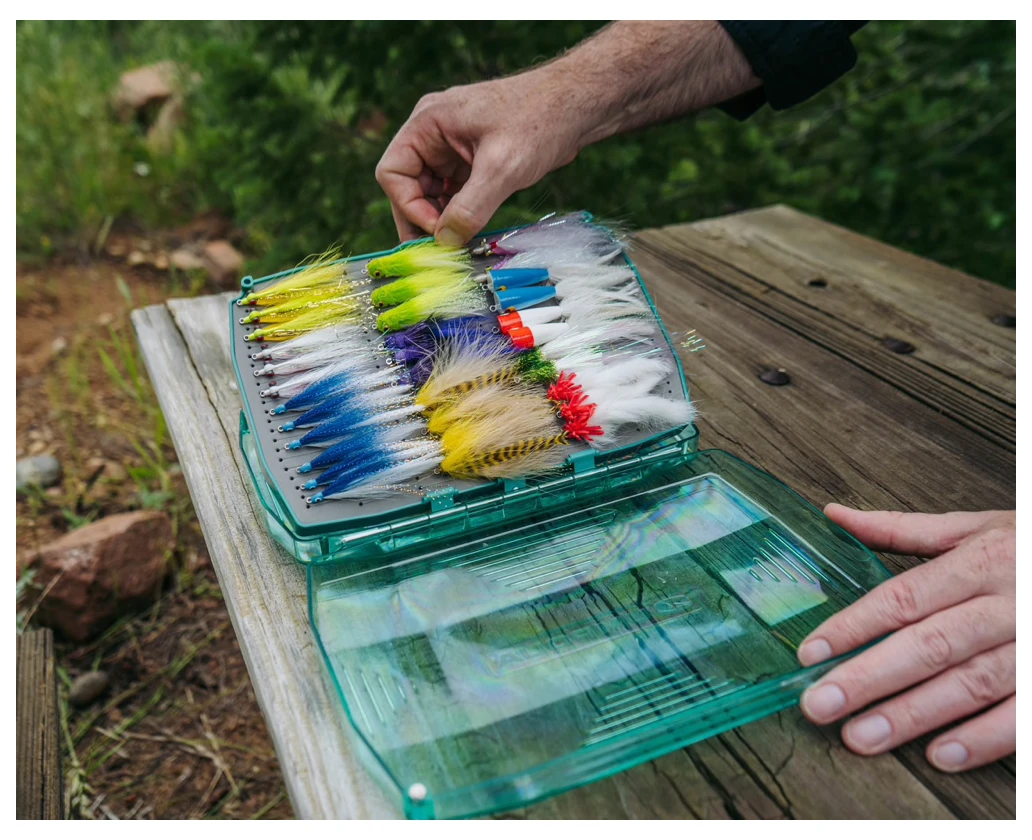 A serious box for serious fly storage. This high capacity box will easily hold the largest bait fish down to your smallest flat’s flies with a “high” side and a “standard” side to offer appropriate headroom for any saltwater fly-fishing adventure. See-through lids allow for easy fly ID and magnetic lid and swing leaf (replaceable) closures offer easy access.